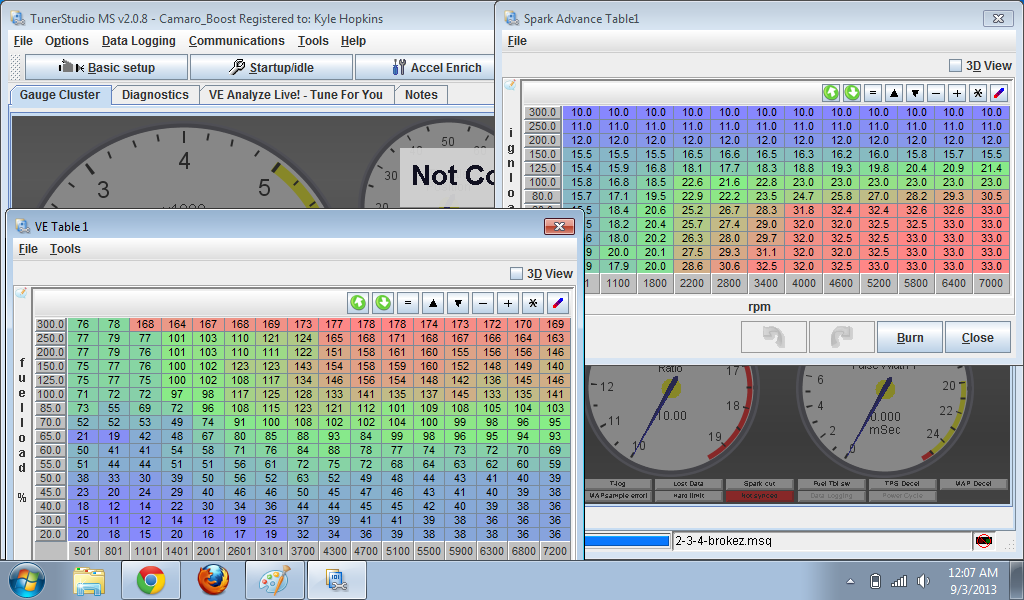 Over the next year the megasquirt board would see a few changes with additions to the prototype board for different things. Some gauges, a 2-step rev limiter, and a few other things necessary to control the soon to come turbocharger. I decided to mount a 10" tablet to the dash of the car to run digital gauges linked via Bluetooth to the megasquirt computer (see the video at the top of the page). Something very modern for the year. The megasquirt even proved useful as a fuel injector flow bench tester after I experienced a series of catastrophic engine failures. Maybe I will post about that sometime!