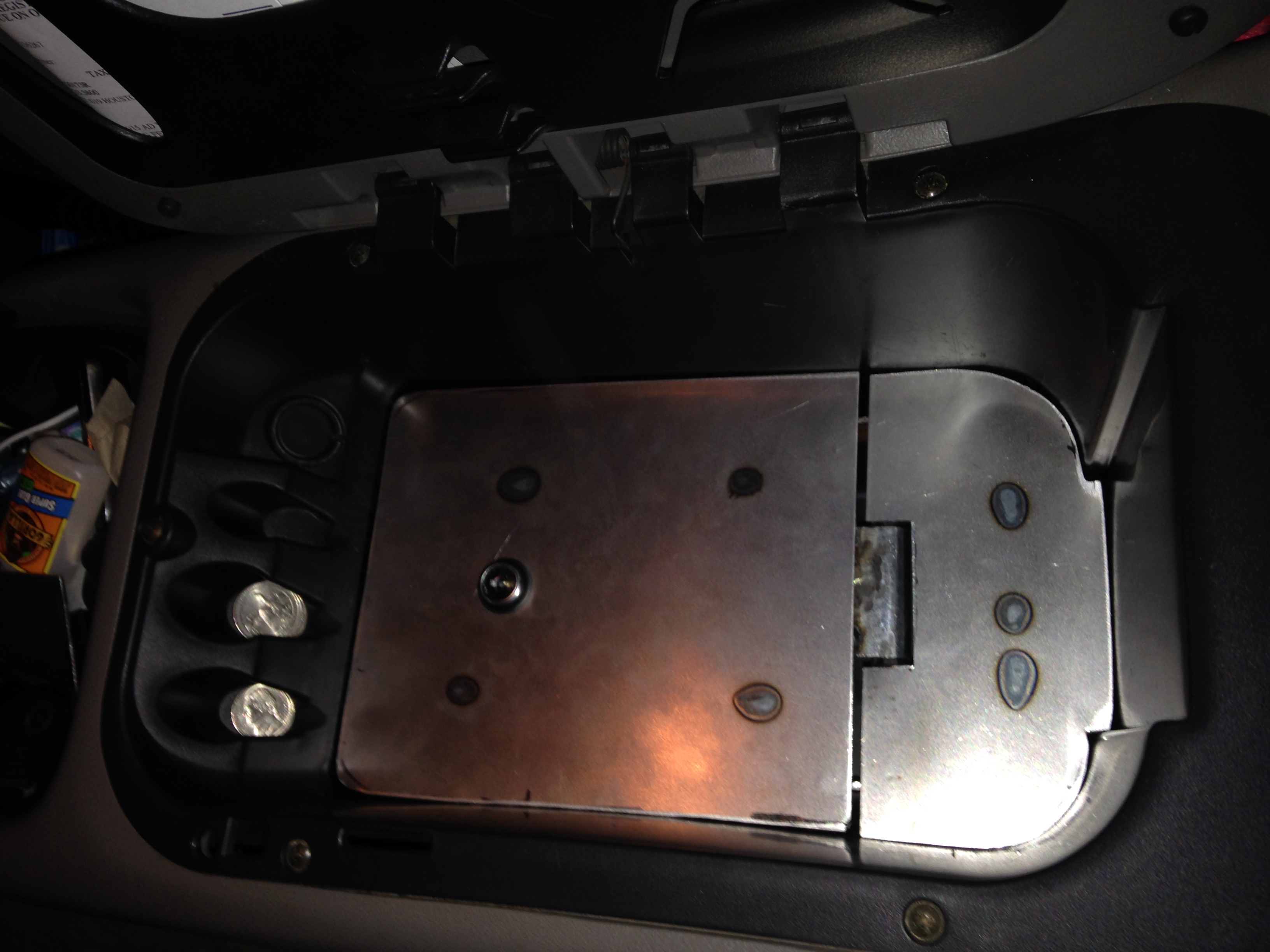 I was planning to make a long road trip and wanted a way to keep my personal things safe such as passports and cash. Sure the truck doors lock, but that doesn't stop someone from smashing a window. The center console of my 2000 Chevy Silverado had room for a 6 pack of 16oz waterbottles. Way too much. So I decided to take up about of half of it with a custom home made safety box / safe.