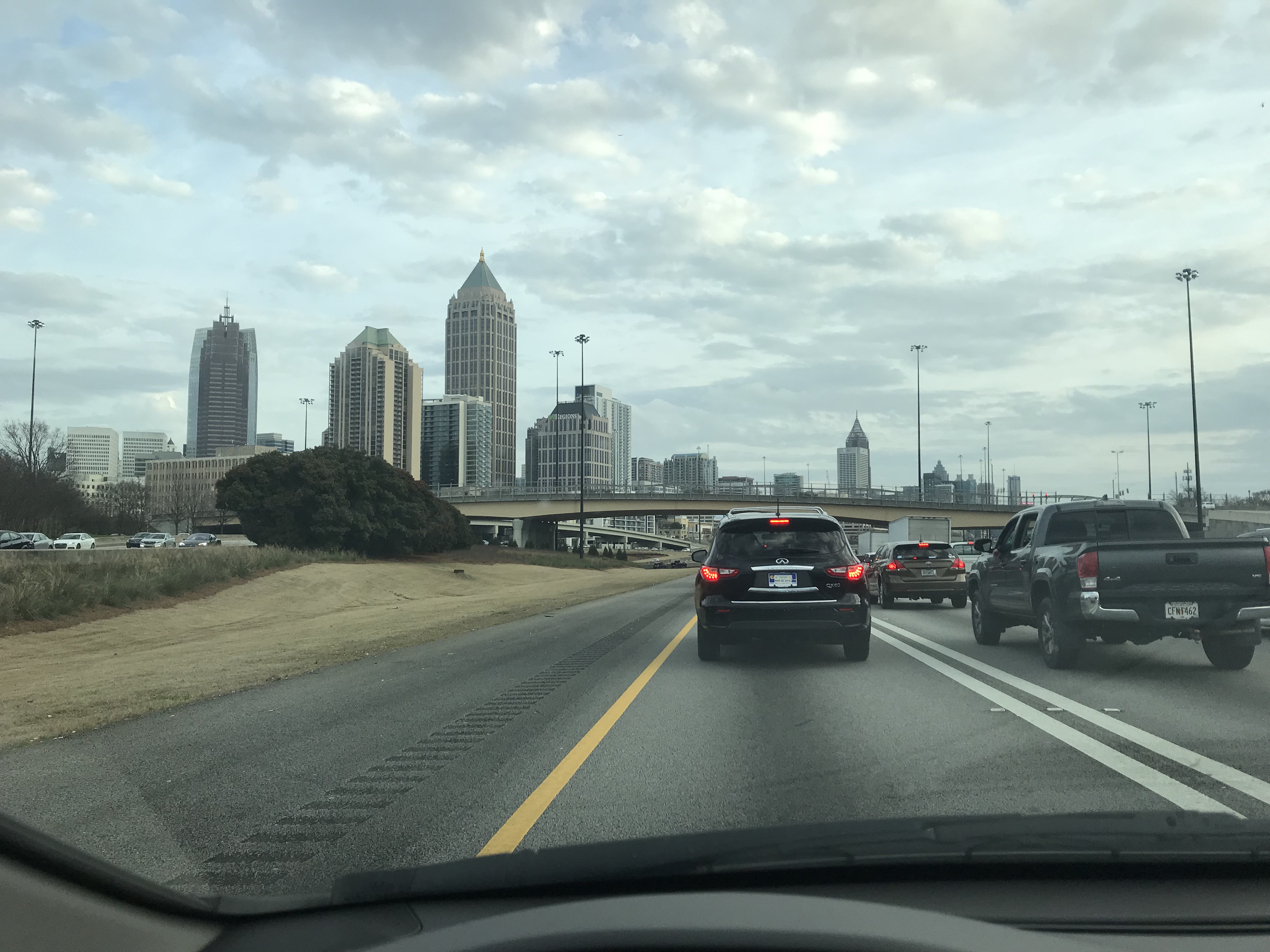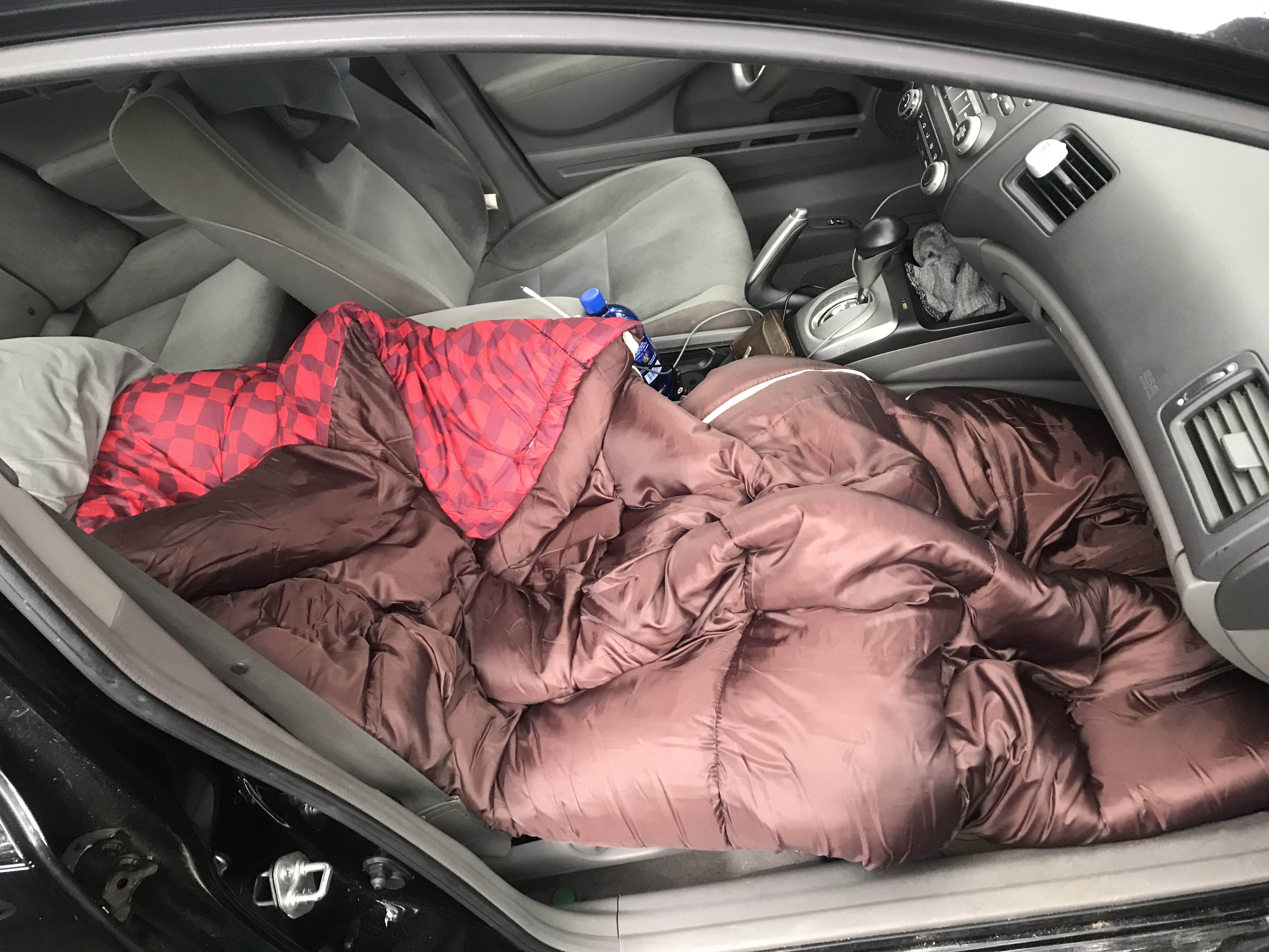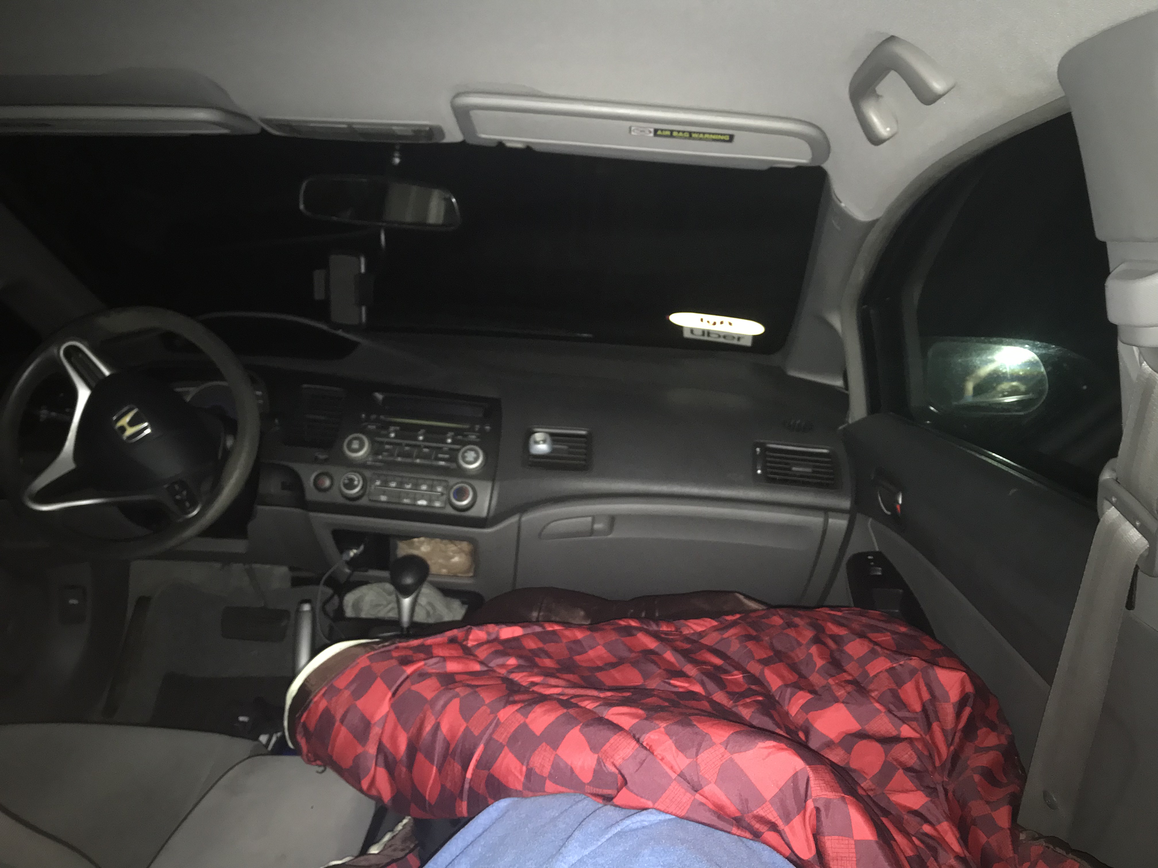 Needing cash as fast as possible so that I could return to South America, my friend suggested I buy a car and start driving uber/lyft. I found a 2010 Honda Civic with low miles, a known bulletproof car, and registered with the rideshare companies! As it turns out my town is not at all profitable to drive in due to lack of demand, so I decided to head to the big city of Atlanta 2 hours away to start working. The commute proved undoable daily so I was forced to start sleeping in the car. My dad bought me a below zero sleeping bag and I threw a duffle bag of clothes in the trunk and started grinding it out.